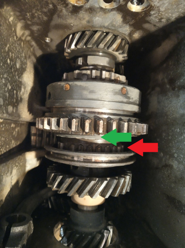 Voilà une vue encore plus précise pour savoir de quoi on parle... Je rectifie une erreur quand je t'ai dit que le grand pignon était celui de seconde, non c'est le pignon de la marche AR et oui, la collerette doit pouvoir rentrer dans le baladeur de 1ère/MA...il y a un sens à respecter pour le montage :