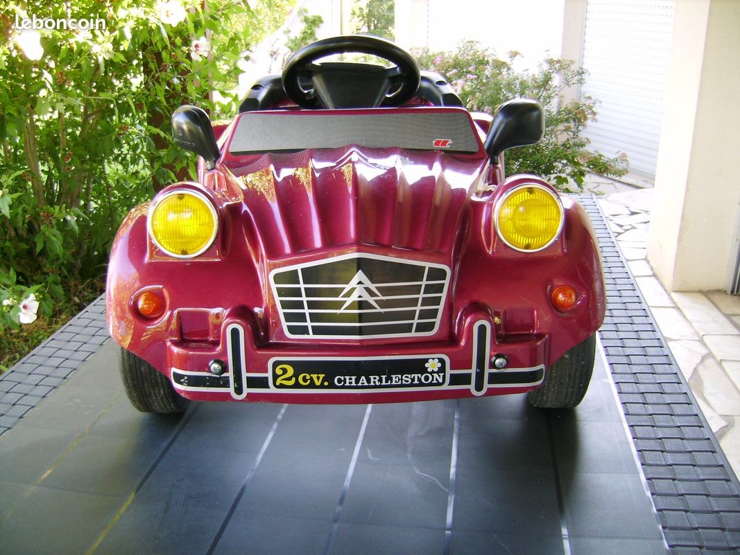 Cette 2CV Charleston est de marque TOYS-TOYS je possède la même en version à pédale pour pièce car le plastique est terni bouffé par les UV et une seconde en version électrique et en TBE avec laquelle mon fils de 3 ans roule presque tous les jours. De la même marque je possède aussi la DS 19 cab électrique immatriculée 1 PR 75 que mon fils apprécie aussi beaucoup, elle est 20cm plus longue que la 2cv. Le problème de ces voitures est les roues en plastique dur qui s'usent très vite, j'ai dû enrober au pistolet à colle chaude les roues motrices afin de garder de la matière usable, maintenant se sont les roues directrices qui en arrivent au même stade.