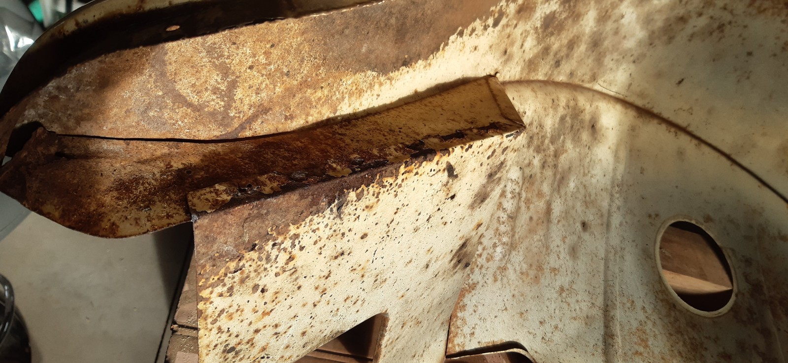 Côté intérieur, le raccord de l’aile est bien attaqué : là-dessus je suis preneur de votre avis :???: : je pensais sabler, passer au Rustol CIP (notamment pour charger les zones inaccessibles entre les plis) resabler et récupérer la liaison à l’étain (ça se faisait dans le temps en carrosserie…). Je précise que je sais souder (TIG, MIG) mais que je ne suis pas équipé à la maison…