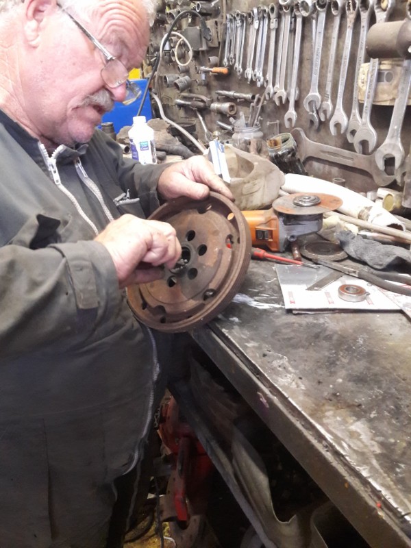 Je suis aussi allé voir mon voisin-copain Patrick pour extraire le roulement de volant d'embrayage. On a un peu galéré pour extraire le jonc, si j'avais mieux lu la revue technique cela aurait été plus facile. Le roulement c'est 10eu chez tous les fournisseurs 2cv, 3eu chez 123 roulement mais 7 eu de port, chez Patrick c'est gratuit, il en avait plusieurs dans ses boites de merveilles, on l'a monté avec le circlip qui va bien