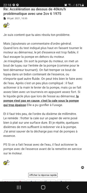 CHARLYSTONE a écrit : 25 févr. 2022, 17:38 Bonjour, l'amorssage ne sert a rien,sur les derniers modèles, car lorsque ta 2cv n'a pas tourner depuis quelques temps, il faut que le moteur se lubrifie, c'est a dire que l'huile doit circuler avant le démarrage ,donc tu doit lancer le demarreur sans démarrer, tu débranche le plus de la bobine par exemple, ou tu utilise la manivelle :salut: