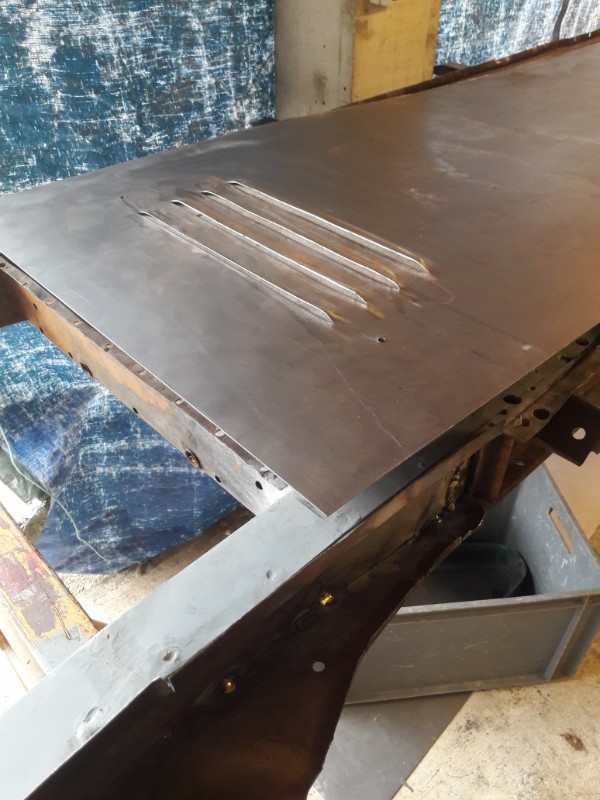 Donc le châssis ressemble à un mannequin anorexique avec les cotes et les ischions qui passent au travers, mais c'est moins pire que je le pensais. Je sais qu'il aurait fallu bouchonner au tig ou mig, mais j'y ai pas accès. J'aurais cependant dû commencer le travail par le centre et "tourner" pour que les dilatations se fassent au max vers l'extérieur. Moi, comme un blaireau, j'ai commencé par le tour pour enfermer une belle poche de tôle au milieu, qu'il a fallu contraindre pour la souder aux renforts centraux.