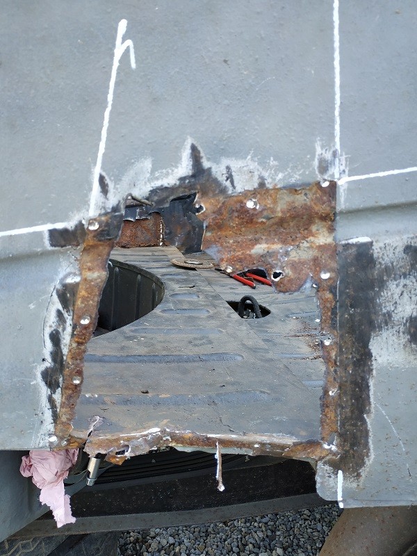 Pour traiter sérieusement l'endroit corrodé que tu présentes, il faut dépointer le support de butée pour pouvoir accéder des 2 côtés, ensuite, découper la tôle au-delà de la zone corrodée, découper un patch dans une tôle saine, y reformer l'embouti et l'adapter à ta découpe (que tu as intérêt à faire la plus" géométrique" possible).