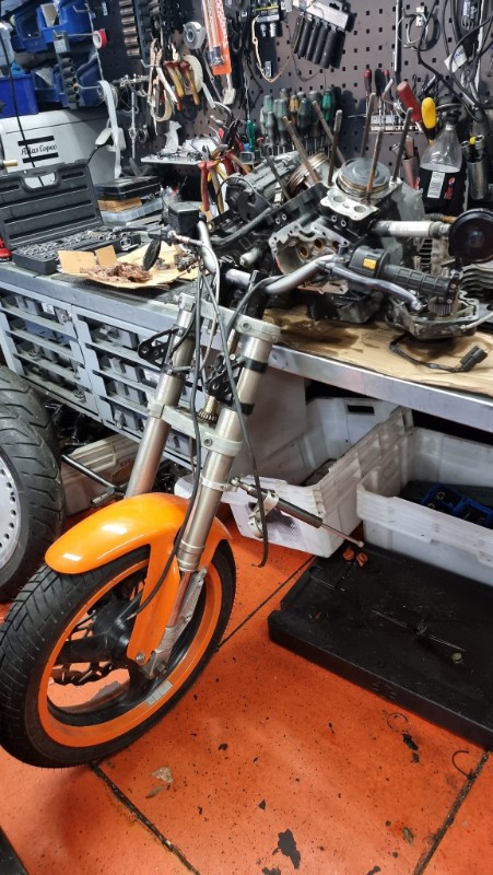 Le trike a passe quelques semaines chez le mecano cet hiver, mise en pieces complete, et renovation intensive. Le moteur etait dans un piteux etat, donc j'en ai achete un d'occas' aux Pays-Bas. Tous les roulements changes, le faisceau electrique refait de A a Z, poignees chauffantes, le cadre repeint, la totale...