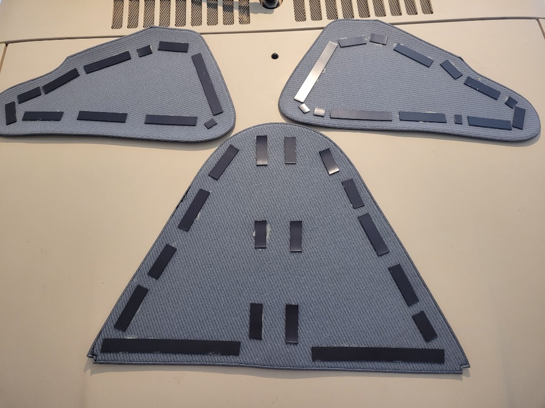 Donc, j'ai collé les bandes magnétiques avec de la colle neoprene... Après un temps de séchage, j'ai positionné les garnitures et là ÇA TIENT Donc , si vous êtes intéressés, sachez qu'un rouleau de 3 m suffit mais il faudra prévoir de renforcer l'accroche de celui ci en le collant avec de la neoprene (côté adhésif) sur les garnitures.