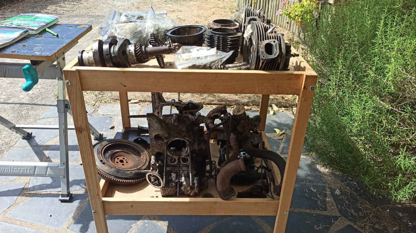 Je suis en train de restaurer une 2cv qui a passé 20 ans dans une dépendance au fond de mon jardin et qui prenait l'eau. J'avais déjà séparé la caisse et le châssis (car je prévois un remplacement de celui-ci), et plus récemment, je me suis attaqué au moteur.