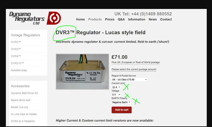 Voilà les caractéristiques de mon régulateur ( sur la photo c'est un 12v, mais le 6 v est identique:( il faut cocher DVR3 Tm : 6v-22A - negative earth) et les coordonnées...si tu parles anglais tu peux tenter de les contacter et/ou envoyer un email...il sont fermés du 20 au 28 septembre inclus.