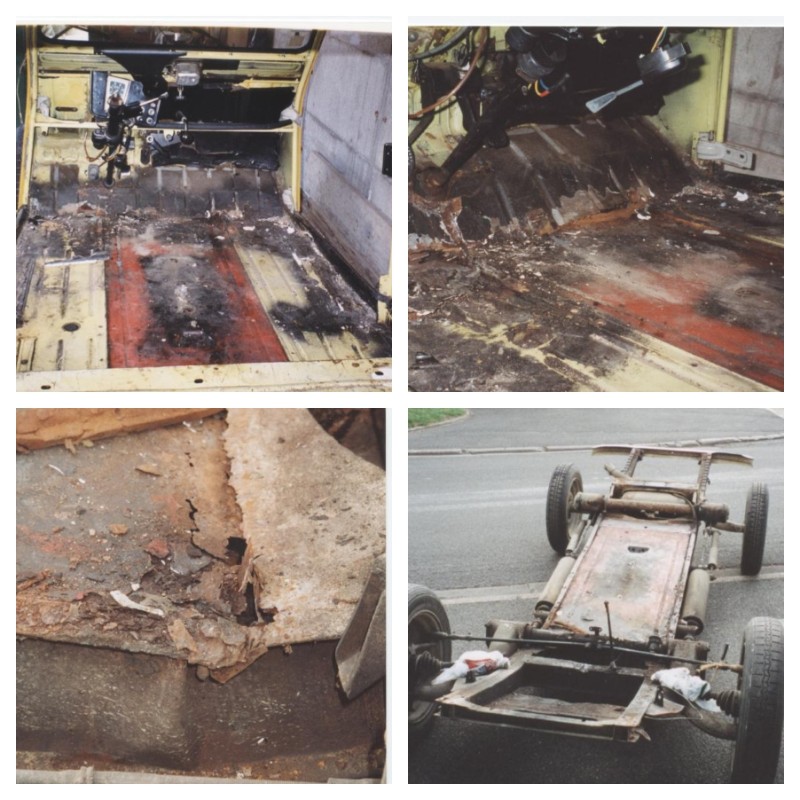 Complètement novice en mécanique, il m'a fallu quelques mois pour me rendre compte que la belle souffrait d'un mal bien connu et que sous sa couleur jaune mimosa (pas d'origine), la rouille avait fait son office sur les planchers et que son châssis n'en pouvais plus.