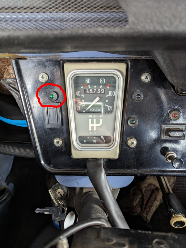 Tant que j'y suis, je nettoie et je traite les traces de rouille au Rustol CIP : Le support de la batterie est dégraissé, nettoyé et traité au Rustol lui aussi : Ayant accès derrière le tableau de bord, je fixe le petit témoin rond acheté à prix d'or : Je suis équipé en pince à sertir et en cosses diverses et variées (plates, rondes...)