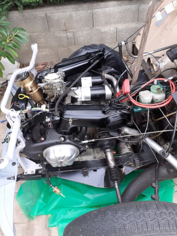 ce matin j'ai remonté le moteur, après avoir changé tout les joints, avec l'aide de mon voisin, j'ai un peu galéré à cause de la boite et du silencieu avant, mais on a réussi avec l'aide du cric pour soulever la boîte, je remet les boîte de chauffage, repeint en noir, les refroidisseurs de disques repeint et le carénage de l'helice, j'ai repeint la barre des phares en gris Titanium,exactement le même gris rosé AC136,en bombe Delux valentine,pris chez Casto,la prochaine je refais celle des par chocs et peut-être les jantes, la nuit tombe, demain je termine les connections et des petites bricoles