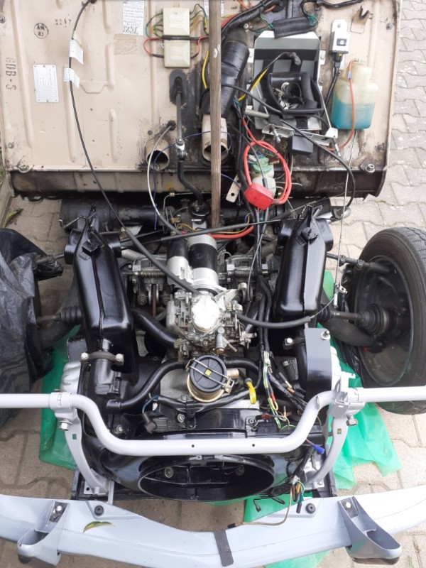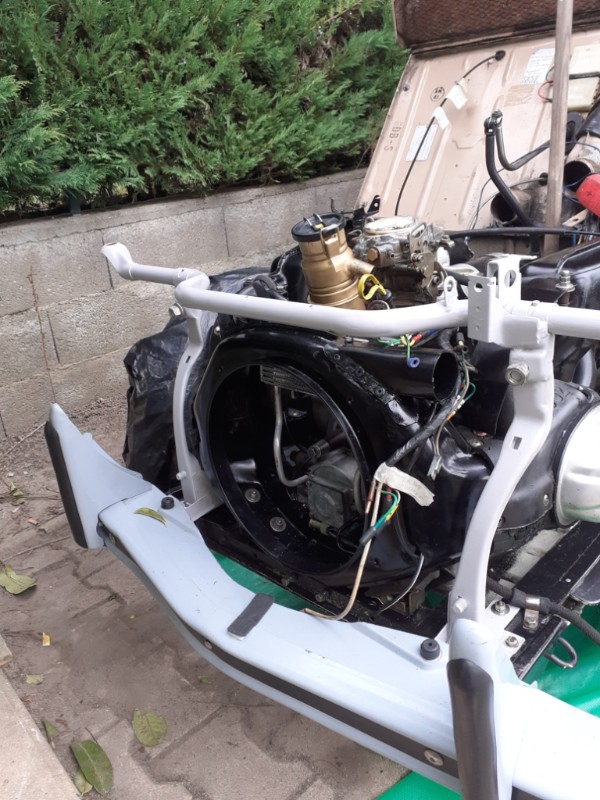ce matin j'ai remonté le moteur, après avoir changé tout les joints, avec l'aide de mon voisin, j'ai un peu galéré à cause de la boite et du silencieu avant, mais on a réussi avec l'aide du cric pour soulever la boîte, je remet les boîte de chauffage, repeint en noir, les refroidisseurs de disques repeint et le carénage de l'helice, j'ai repeint la barre des phares en gris Titanium,exactement le même gris rosé AC136,en bombe Delux valentine,pris chez Casto,la prochaine je refais celle des par chocs et peut-être les jantes, la nuit tombe, demain je termine les connections et des petites bricoles