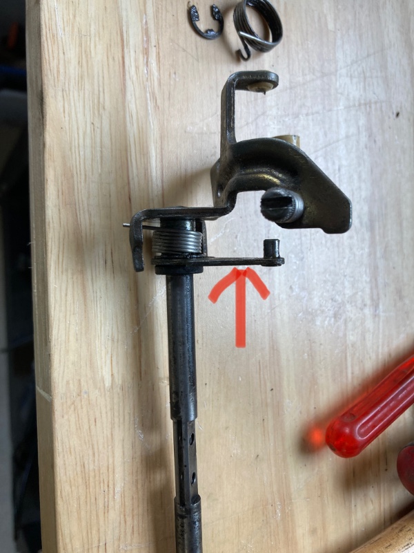 Malgré un papillon récalcitrant j’ai finalement extrait mon axe. Ce qui m’a permis d’accéder facilement à un ressort… mais pas celui qui me pose problème ! Je suis maintenant face à cette pièce qui m’empêche de sortir le ressort en le faisant coulisser le long de l’axe. J’ai bien essayer de lui taper un peu dessus, mais ça ne bouge pas et je ne veux pas insister par peur de tout casser.