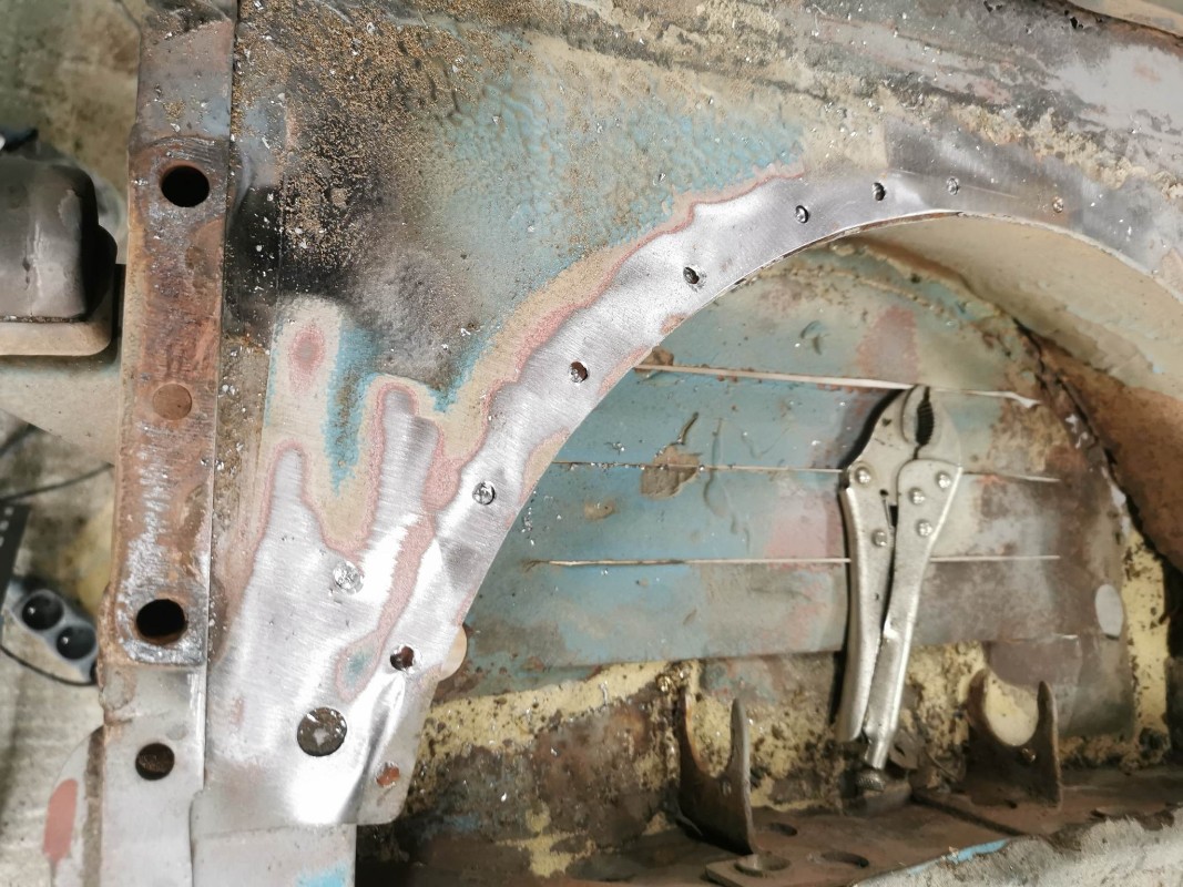 après j'ai combler les petits trous qui était sur un renfort intérieur ( point de soudure au semi auto avec une plaque de cuivre derrière pour faire écran c'est pour évité de percé la tôle et meulage des soudure )