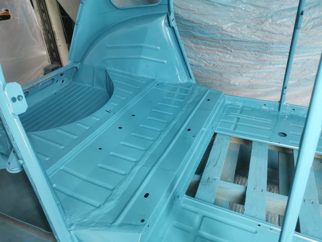 pour les intérieurs d'ailes arrière et l'intérieur du coffre apprêt époxy et peinture après 45 mn de séchage de l'apprêt époxy on appelle çà mouillé sur mouillé pas besoin de poncé