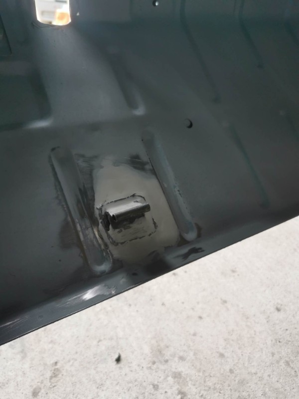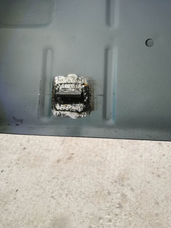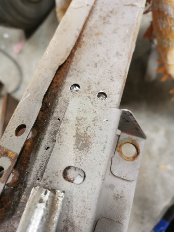 donc découpage de la tôle pourri fabrication d'une tôle j'ai percé 2 trous plus loin pour faire une soudure bouchon pour tenir la tôle remis soudage meulage et traiter convertisseur de rouille ecar