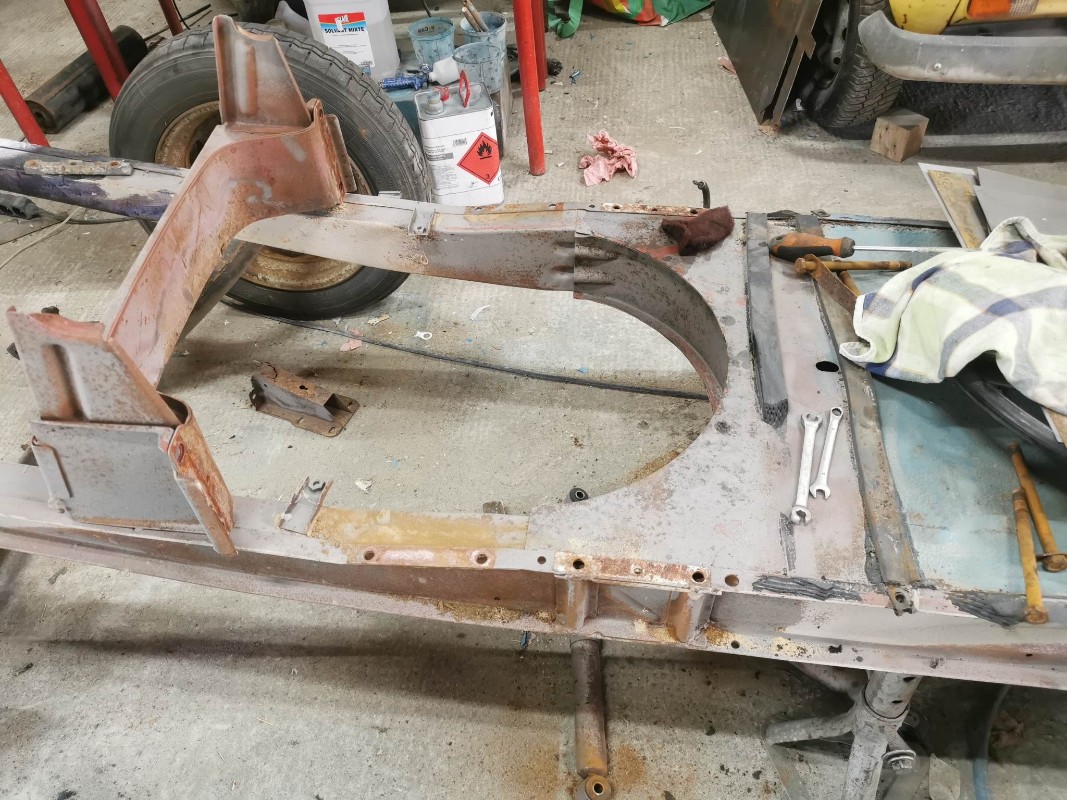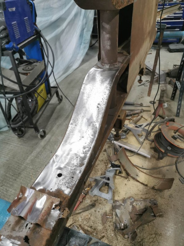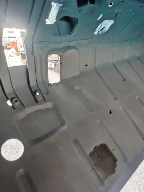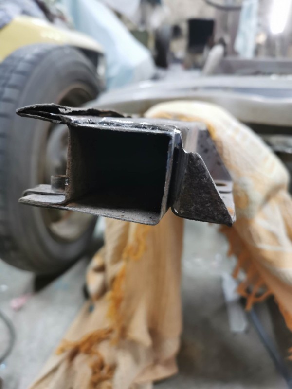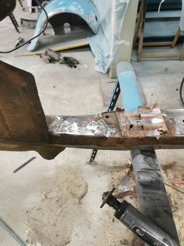 donc j'ai décidé de le refaire découpe des tôles partiellement dessus dessous au niveau de la fixation de l'essieu avant droit la tôle est pourri donc j'ai découpé remis une tôle souder meuler et remis un renfort voir photos ( pour info j'ai déjà fait cette réparations il ya une trentaines d'année sur des méharis et ca a jamais bouger j'en avait restaurer 10 a l'époque )