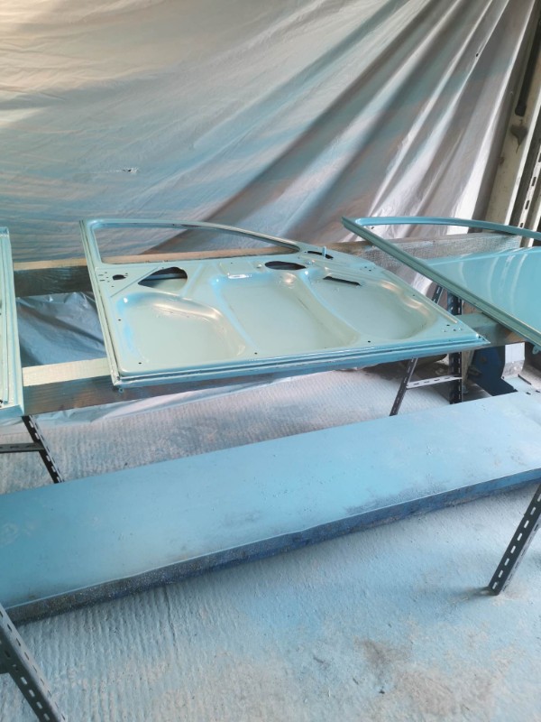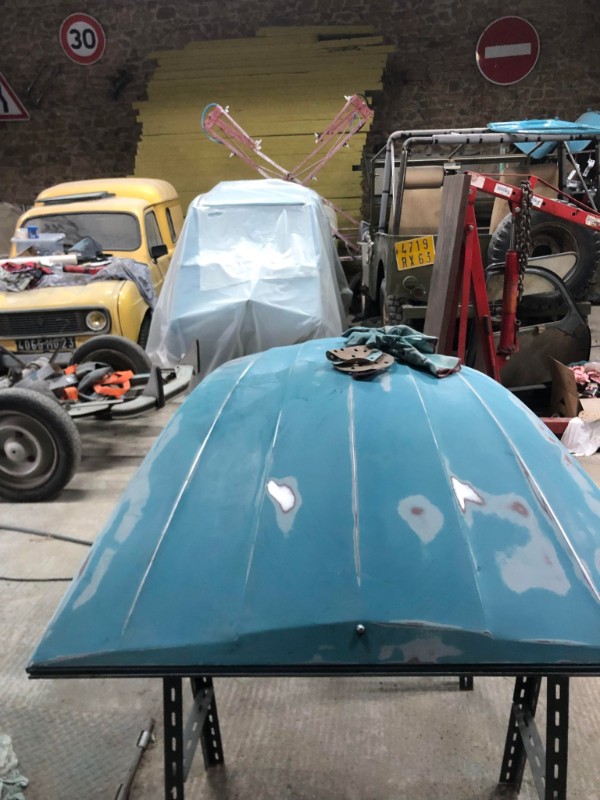 reste plus que les 2 ailes avant cabossé et sablage des intérieurs . le capot qui a un trou et un gros choc sous la plaque immatriculation . le volet d'air a refaire quelle petits trous .les 2 coques de phare . les joues d'ailes avant et âpres fini le bleu je vous met ca en photos suivant les étapes bien sur