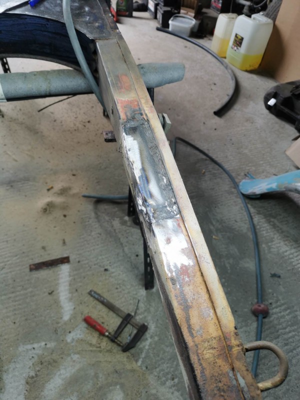 petite réparation du brancard arrière gauche découpé soudure d'un tôle et ponçage