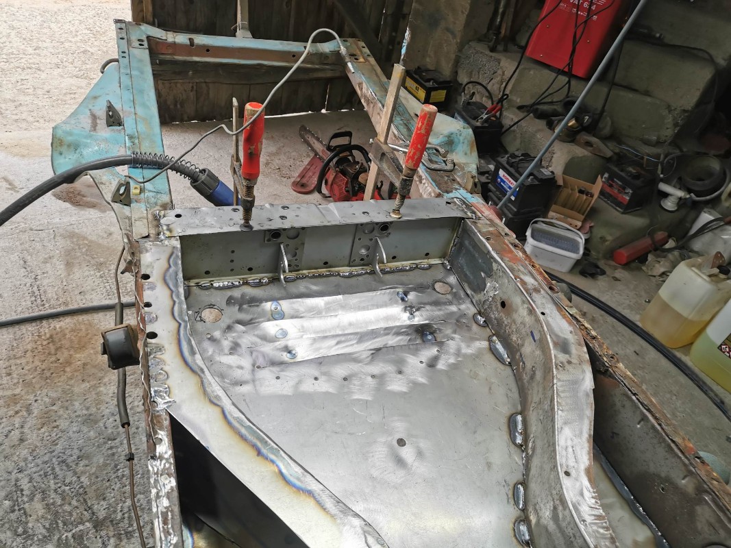 pose et soudage des points de soudure de la travers du frein a main ainsi que la tôle de renfort courbé et de la tôle protection moteur