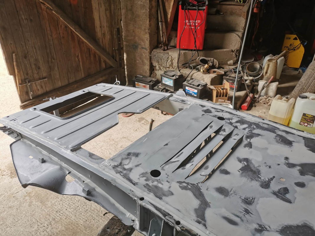 un petit coup ponçage du dessous du châssis au 240 avec une ponceuse orbital et tu papier 240 a sec de chez ECAR sur le convertisseur de rouille et passage de l'apprêt époxy pendant que l'apprêt époxy sèche