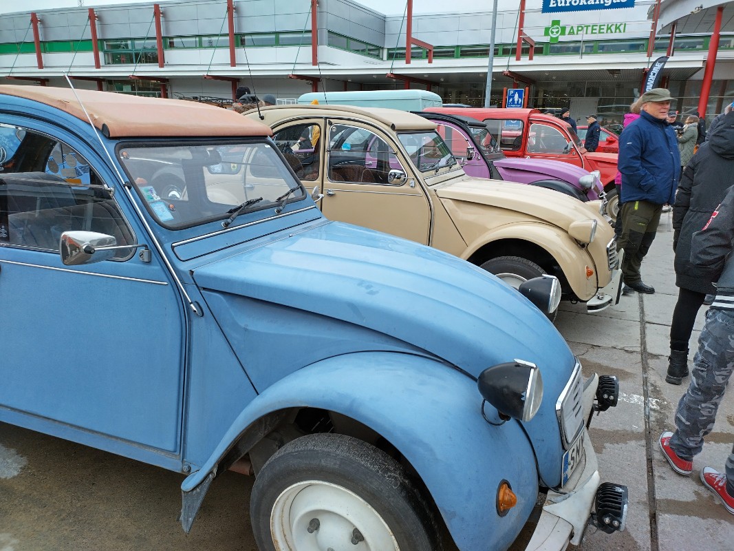 Ici le 1er Mai, c'est Vappu, et ca marque le debut des rassemblements auto / moto pour la saison. Nous avons rejoint quelques deuchistes et environ 120 autres passionne(e)s pour quelques heures sur le parking du supermarche et une petite sortie en ville! J'etais surpris de voir des centaines de personnes au bord de la route quand on est parti, qui nous attendait!
