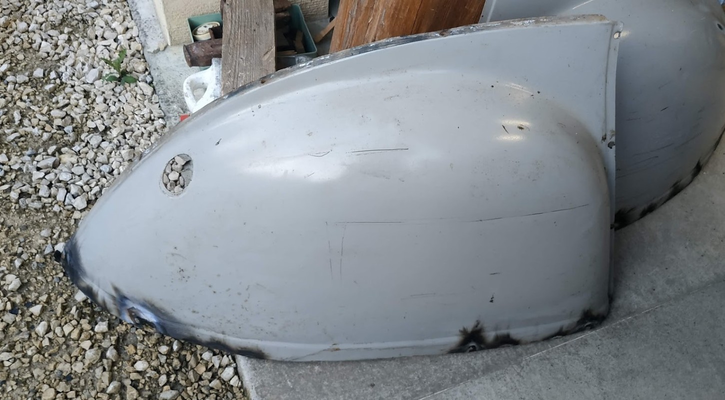 J'ai mis à blanc l'aile arrière droite pour voir ce que ça donne, ça tombe plutôt bien. Il y aura juste un peu de débosselage à faire avant peinture.