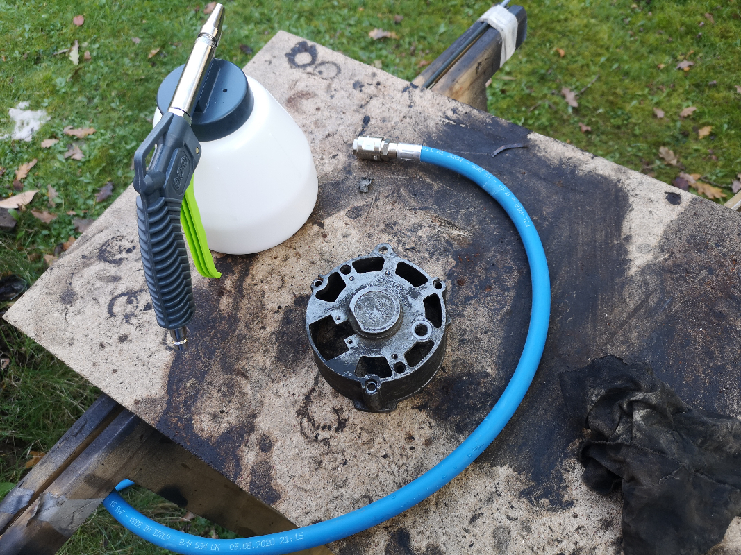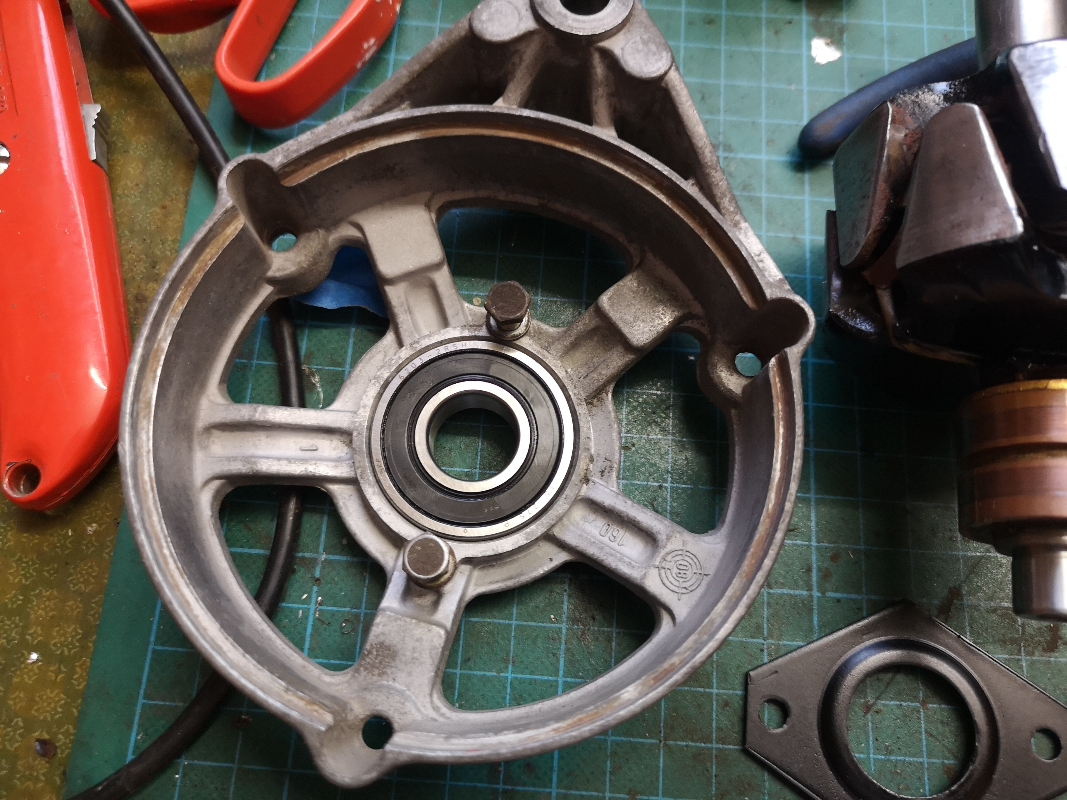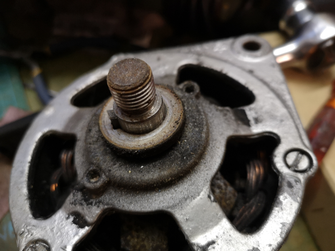 L'axe du rotor se détache du carter avant avec un maillet assez aisément. Le roulement arrière est monté sur le ressort. Je l'ai sorti avec un extracteur (l'axe n'a pas de trou de centrage, j'en ai pointé un moi-même).