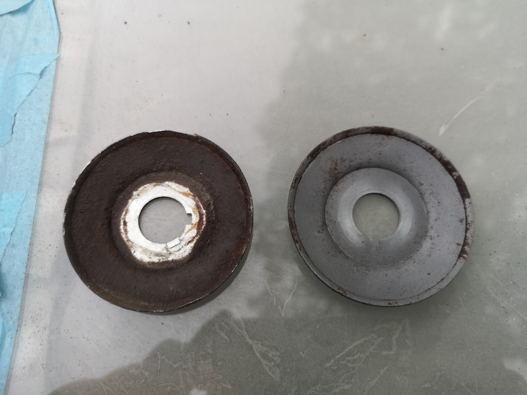 Ordre d'assemblage des rondelles-écrous-espaceurs. (oui, c'est un autre alternateur, j'ai dû le démonter parce que j'avais oublié de photographier le premier...) Les deux demi-poulies devraient sortir facilement. Sinon, un extracteur aide pas mal... Attention à la clavette!