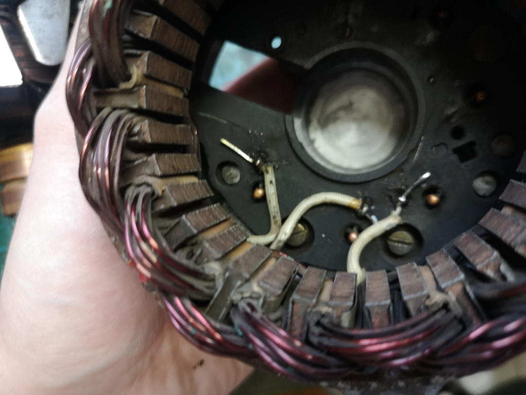 Le carter "avant" côté poulie sort généralement avec le rotor, et de l'autre côté, il reste le stator, le pont de diodes. Attention à ne pas essayer de sortir complètement le stator, il est encore soudé au pont de diodes. Soit on s'amuse à dessouder le stator avant de sortir le pont (pas évident parce qu'il faut se contorsionner avec le fer), soit on fait l'inverse (ce que j'ai fait). Il faut donc dévisser la borne du positif à l'arrière (deux écrous), puis les trois vis à tête fendue à l'intérieur. Le redresseur sort avec le stator. Un petit coup de fer à souder permet de sortir les trois fils.
