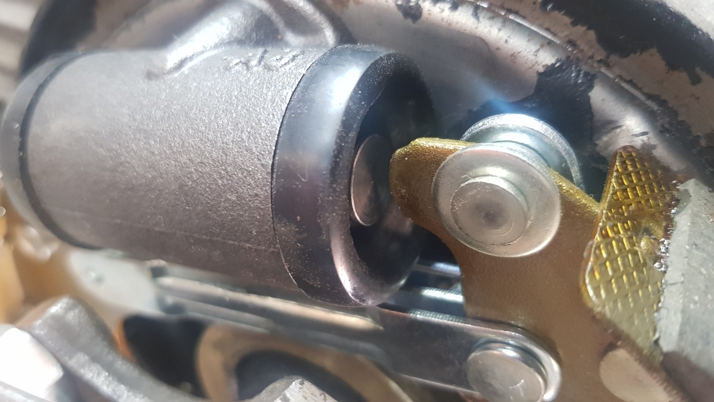 j'ai donc monté un coté et fait mes réglages d’excentriques et escargots a l'aide d'un outils maison : Sauf que ... je trouve les pistons du cylindre de roue très loin des mâchoires : De plus ... je constate que les cylindres qui était montés sur cette boite sont légèrements différents ( pas la même longueur ) a droite et a gauche :