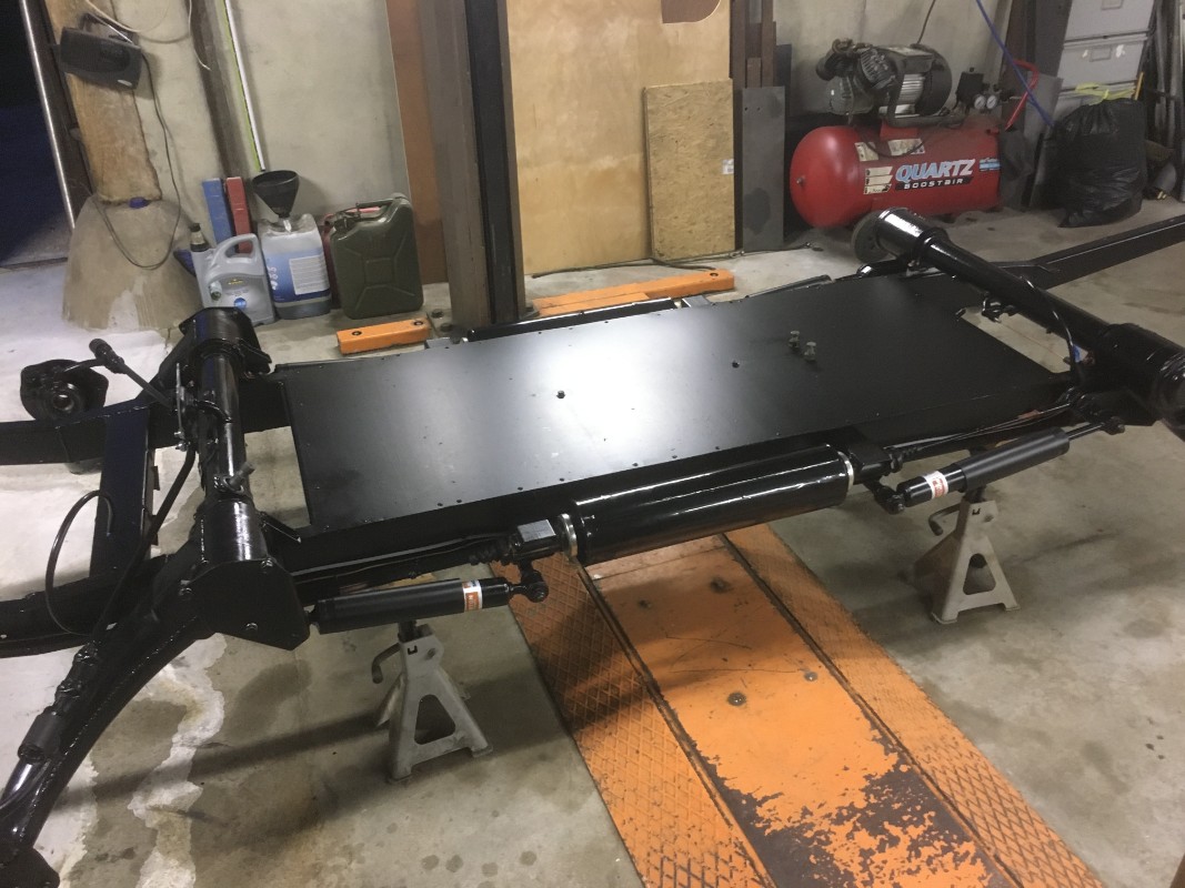 Pose du réservoir et du support de caisse . Je sais c'est pas grand chose mais mise à nu du support et peinture 2 couches hammerite puis au démontage du châssis j'ai du couper les boulons des plaques filetés qui maintiennent le support de caisse sur châssis car indesserrables er par la suite de retarauder les filetages en 10 car je n'avais pas les boulons spécifiques , toutes ces petites choses prennent du temps