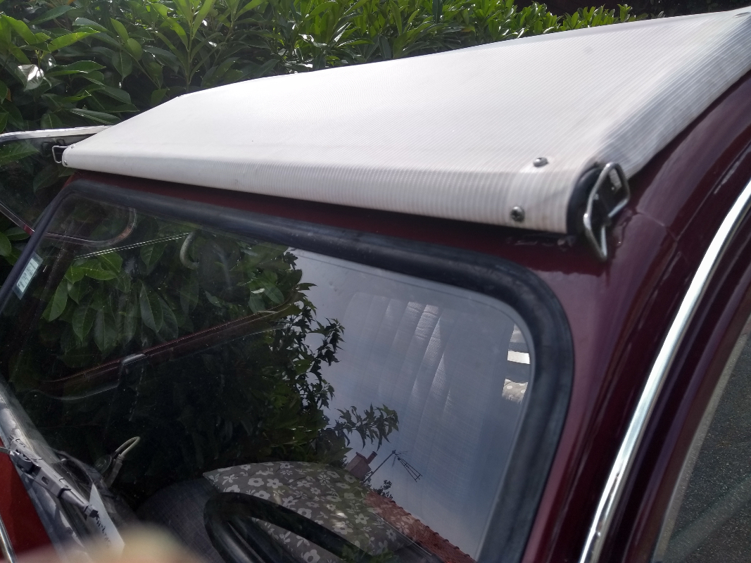 bon, ma question est : tu avais déjà un système a ouverture intérieur installé sur ta deuche , et tu as eu juste à "modifier" une capote a ouverture extérieure que tu a récupéré, et installé sur le systeme? Peux tu montrer sur une photo le systeme à ouverture interieur sur ta deuche au dessus du pare brise?