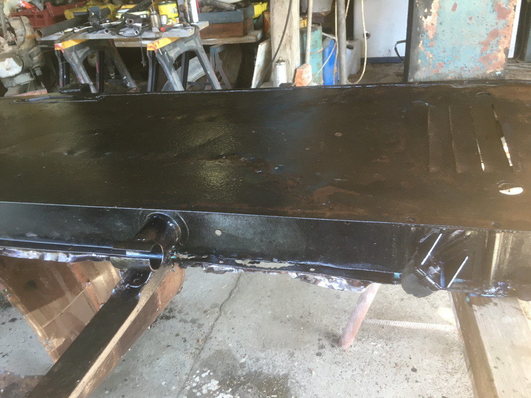 Ce matin, j'ai profité des températures pas trop élevées pour passer une nouvelle couche de RUSTOL par pistolage à l'intérieur du châssis et une couche de FEROSE sur la plaque inférieure :