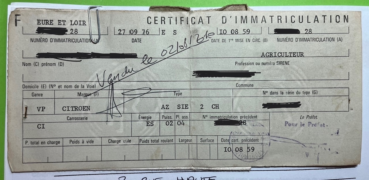 Étant déjà membre de l'aventure Peugeot avec la 205 que j'affectionne également beaucoup, il faut que je me renseigne auprès de leur service pour obtenir le document (attestation de date pour véhicule de collection) qui me permettra la conversion en carte grise dite "collection". Néanmoins, vu l'état actuel de l'automobile Citroën, je doute d'une obtention rapide !!