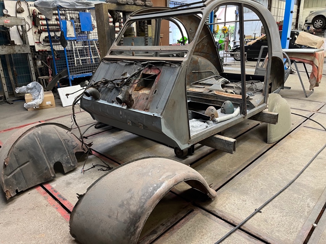 La 2cv a été entièrement démontée, châssis réparé et ainsi conservé, il était plutôt en bon état en réalité. Les parties mécanique moteur-boite-embrayage, trains roulants et système de freinage entièrement revus. Quelques éléments de carrosserie, capot, portes avant et ailes arrière déjà préparés chez le même carrossier que je fais travailler.