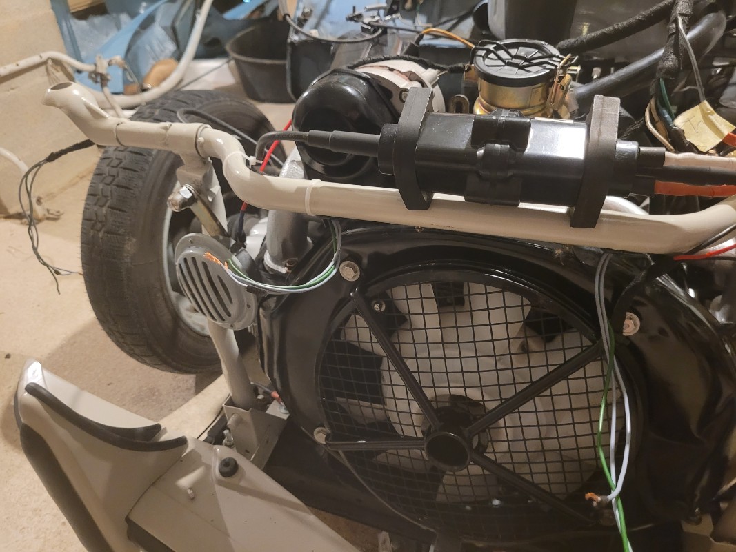 Je finirai le faisceau des phares au dernier moment. Mise en place du faisceau electrique, tige d'accélérateur, tige de réglage des phares, branchement de la batterie, son petit cœur quoi J'ai fabriqué une "interface" en plastique pour éviter le court jus.