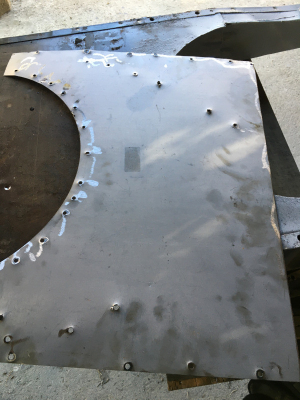 Ensuite, perçage de la tôle de réparation, puis meulage en vue de la soudure par bouchonnage : Assemblage de la tôle au châssis à l'aide de vis de 6 mm pour la maintenir plaquée le plus possible (en plus des pince-étaux !) Mise en place de serre-joints pour maintenir la tôle plaquée au centre de la plateforme.