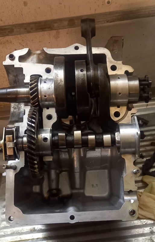 J'ai remonté vilebrequin et arbre à came et prépositionné le corps de la pompe à huile.