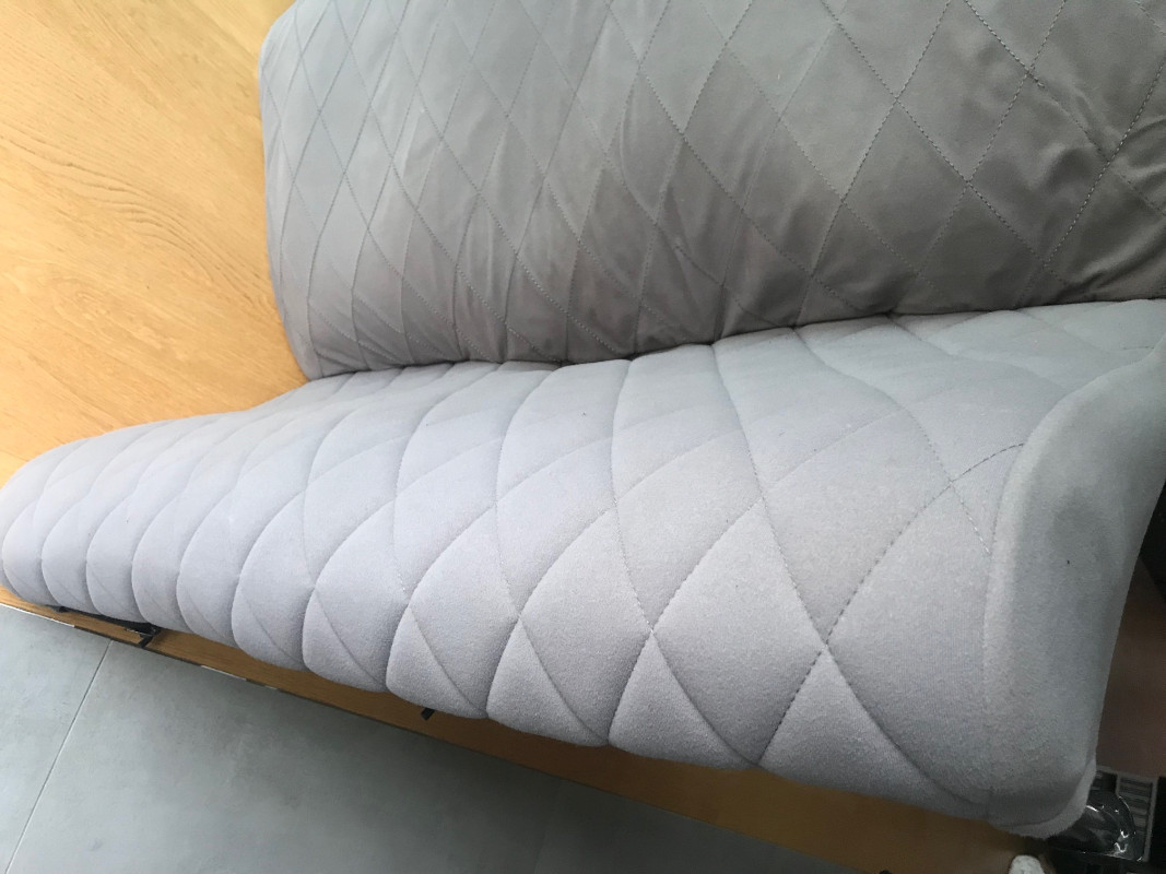 Je pensais remonter les housses d'origine qui ne sont pas percées, juste quelque fils décousus ; toutefois, il s'avère que le tissu est franchement très fin, et la petite doublure intérieure permettant de glisser trouée de partout... Le rendu n'est pas formidable, ça plisse, le tissu est détendu, trop fin, bref je suis un peu déçu.
