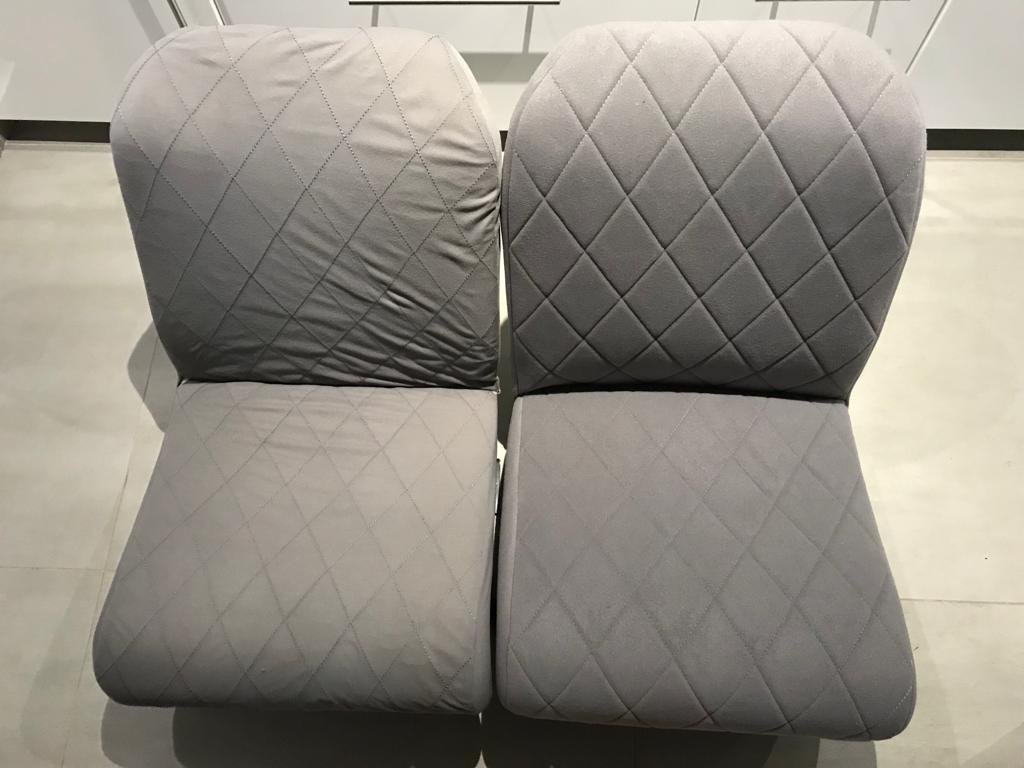 La qualité semble également à la hauteur, la couleur est légèrement différente, toutefois les miennes ont 33 ans et leur couleur a dû évoluer dans le temps.. à gauche les MCC, à droite l'assise de la banquette d'origine, curieusement la seule pièce qui ne soit pas partie en charpie jaune et conserve encore ses croisillons bien en relief.