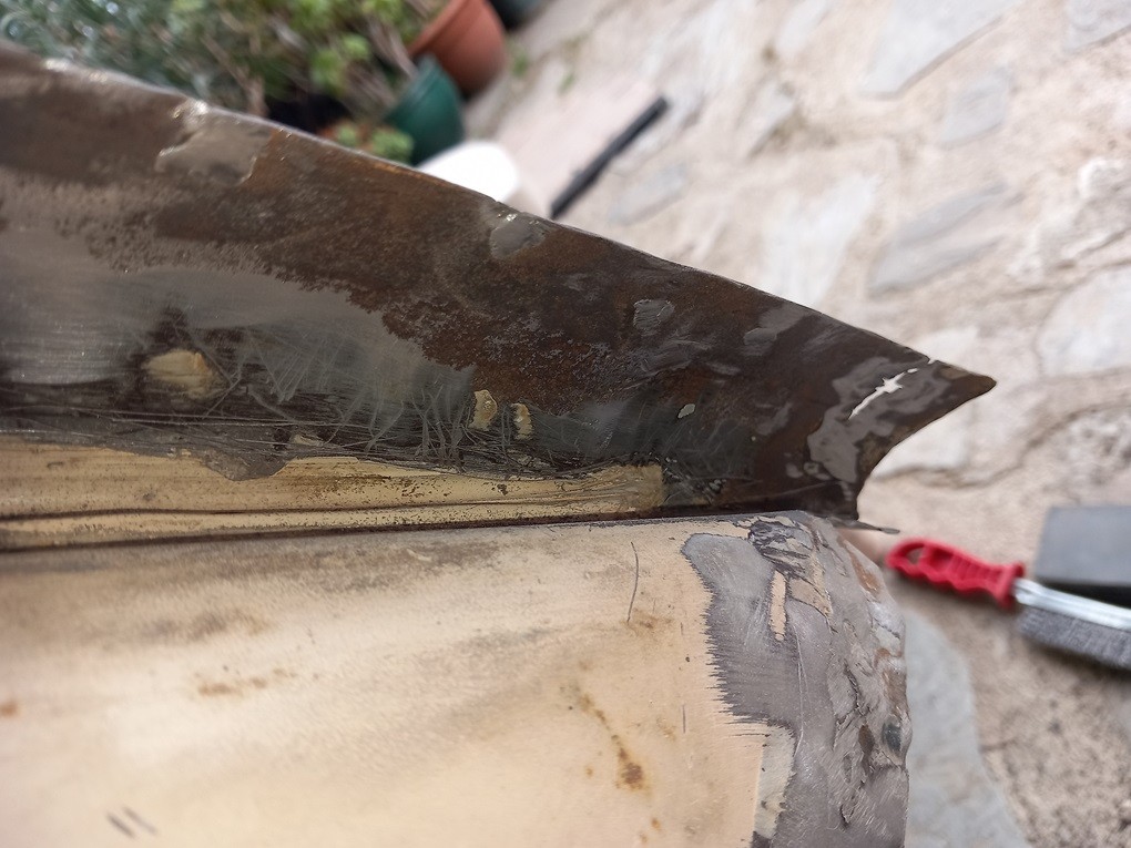 puis j'ai attaqué à la disqueuse avec brosse puis disque métal en y allant trés doucement afin de ne pas percer la fine tole de la partie supérieure qui servira à souder la pièce neuve, tout en enlevant un max de rouille. Je vous avoue que cela m'a pris beaucoup de temps...