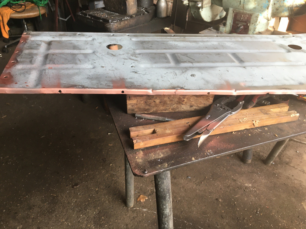 Une méchante tôle rouillée et à laquelle il manquait une patte d'attache, avait échappé à mon attention. J'en ai donc refait une "neuve", en utilisant les tôles de plancher récupérées, qui même rouillées, ont encore des parties réutilisables..