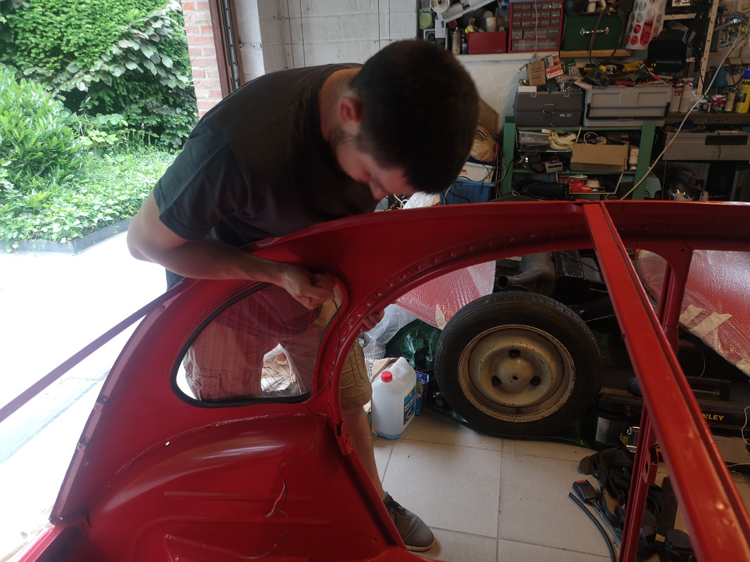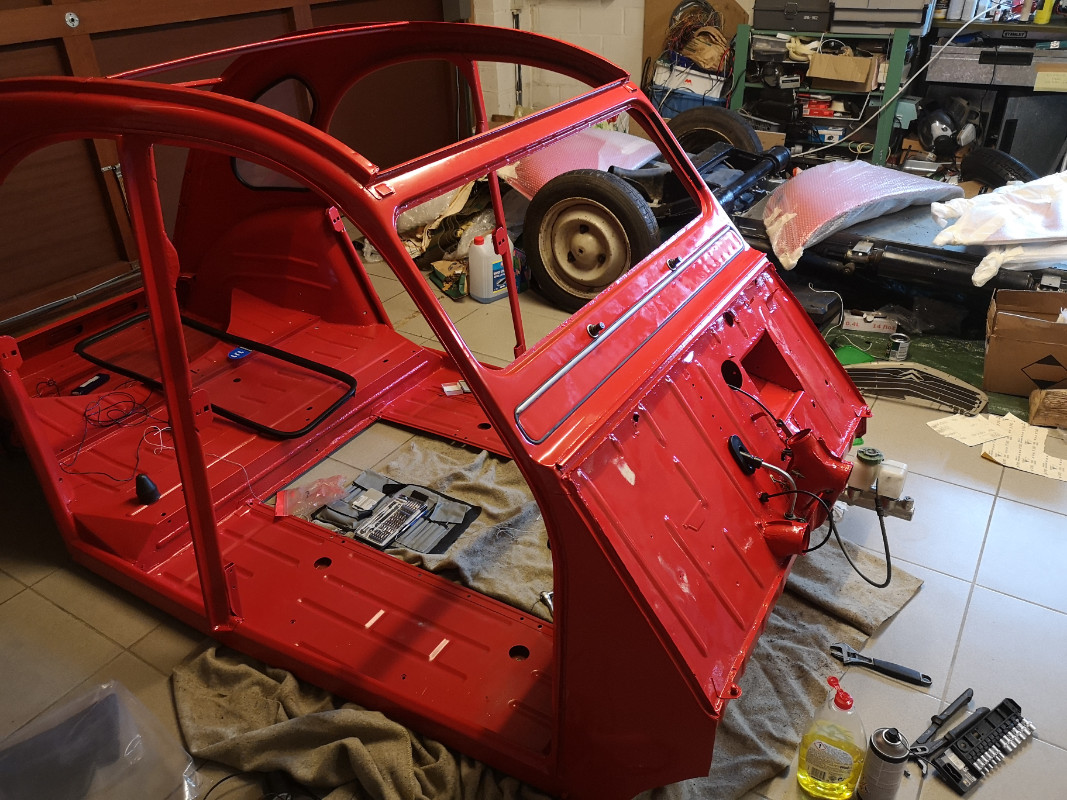 Dans l'ensemble, la caisse est bien refaite. Les soudures sont propres (quand on sait que les bas de caisse, les planchers, baie de pare brise, passages de roues, fond de coffre, jupe arrière ont été changés), pas vraiment l'impression d'avoir vu bcp de mastic sur les photos que Thierry m'a envoyées (photos publiques, sur la page FB de 2CV-CLC). Je regrette juste la peau d'orange sur la dernière couche de rouge, j'attends qu'elle soit sèche à cœur avant de rattraper ça (suite à ses conseils). J'ai aussi eu quelques soucis d'ajustement des fermetures de portes (5mm en trop d'un côté) et l'alignement de certains trous ont été revus (montage caisse-châssis). Vu que certaines pièces sont adaptables, je m'y attendais un peu et j'ai pu tout ajuster au final. Je recommande son travail, c'est quelqu'un de passionné, qui sait ce qu'il fait et qui n'hésite pas à rester des heures au téléphone pour que tout se passe pour le mieux :tchin: