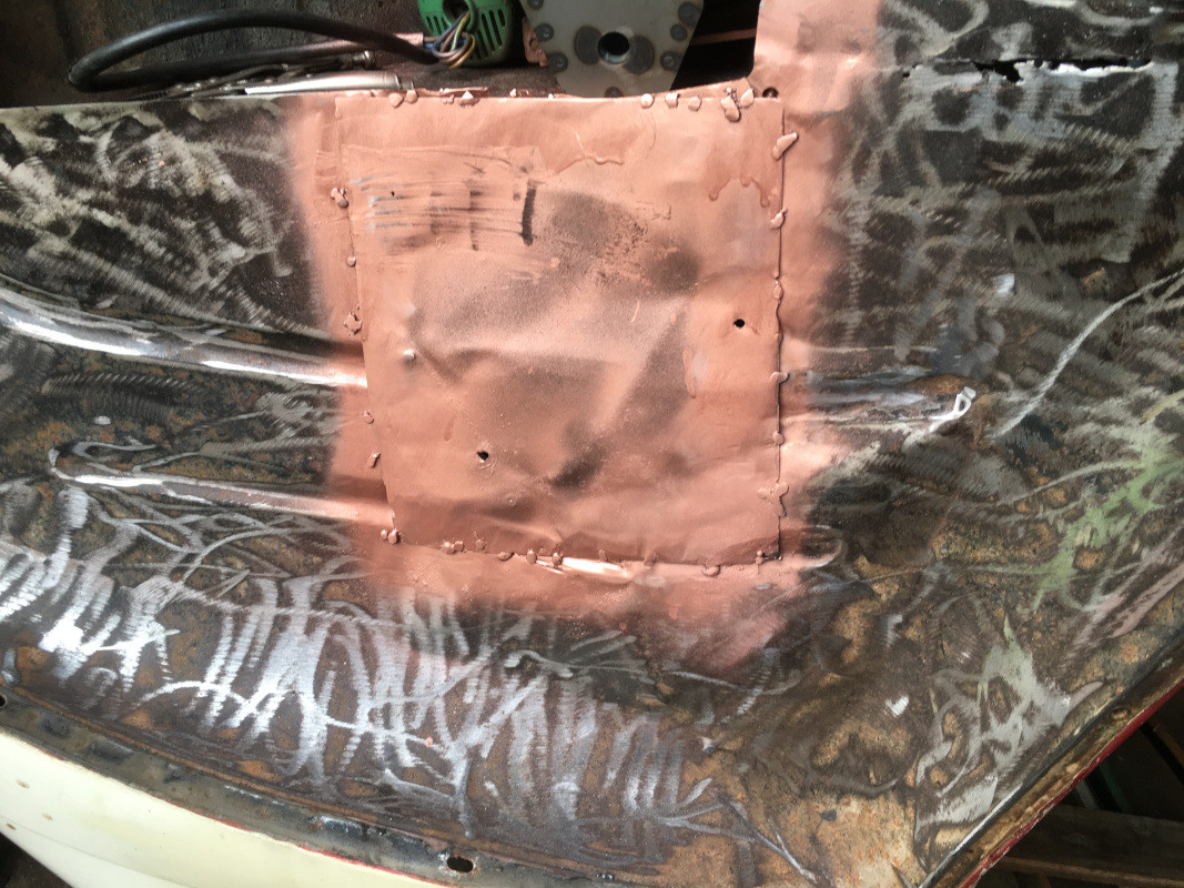 J'ai procédé aux soudures de la tôle d'auvent avec le plancher pédales (pas trop mal réussies, malgré de gros pâtés disgracieux à meuler !) en ayant préalablement placé à l'arrière des tôles à souder, une plaque de cuivre calée avec des bois. Les autres soudures furent moins réussies, à cause du traitement préalable des tôles, ou d'un écartement pas assez réduit entre elles ?