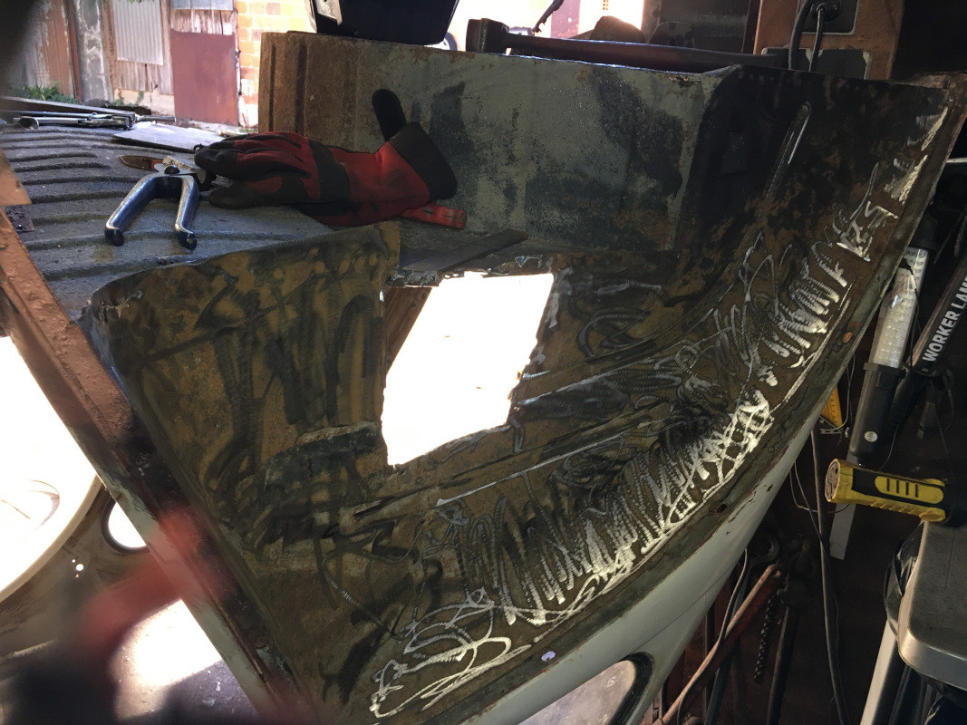 Découpage des tôles corrodées : Du dessus, on peut voir que les tôles avaient été enduites d'un produit "anti-gravillons", d'une marque bien connue