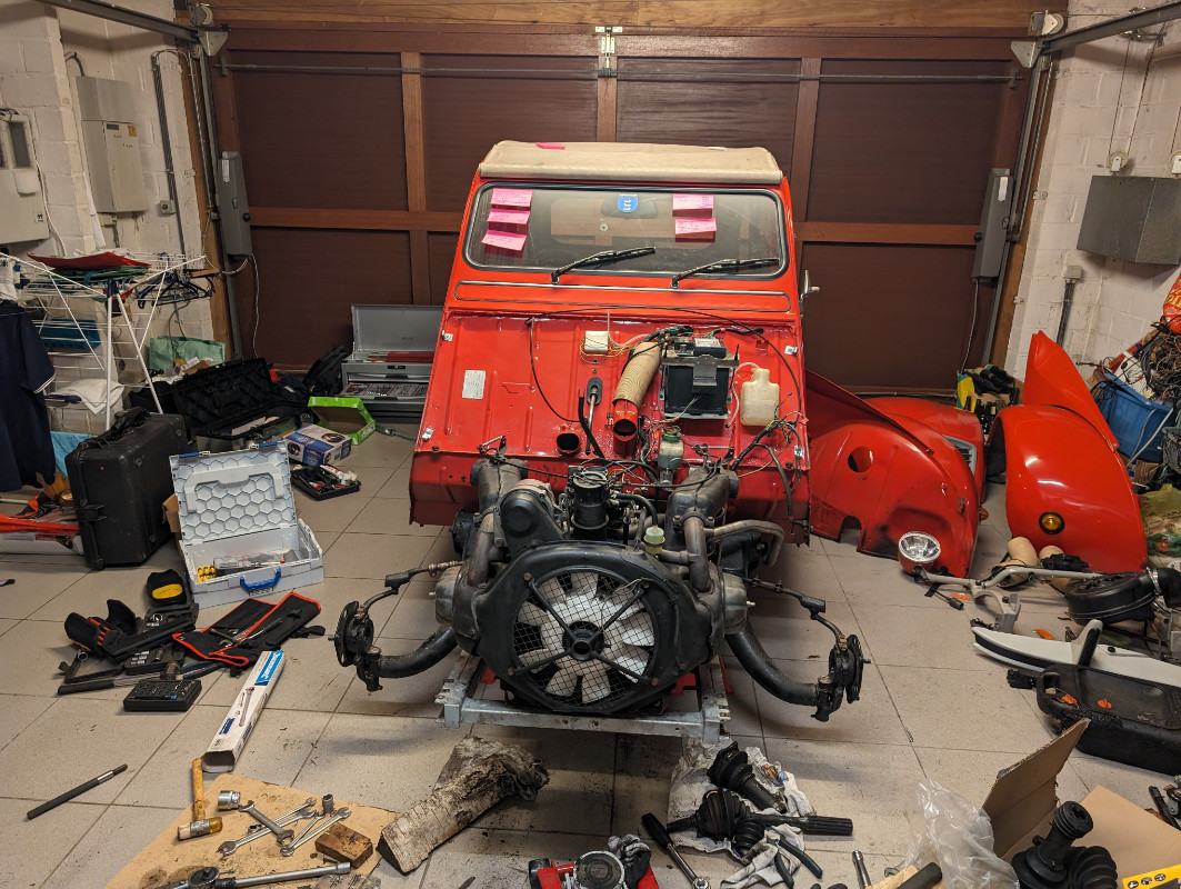 Cette semaine a été chargée. Comme dit plus haut, j'avais quelques soucis d'embrayage (il patinait beaucoup à mon goût), mes disques avaient encore de la matière mais étaient trop proches de la cote d'usure à mon goût, mes soufflets de cardan (d'origine!) étaient HS et je n'avais pas encore vidangé la boîte (je sais, pas bien!