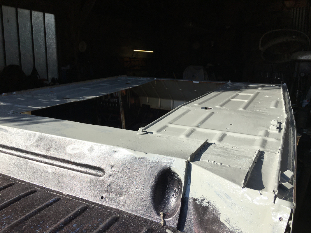 Et j'ai gardé la tôle latérale d'auvent, finalement... Ensuite, masticages (légers) des quelques trous restants, souvent situés dans les coins de tôles... En suivant, j'ai préparé les tôles neuves (léger ponçage, suivi d'un dégraissage à l'acétone) avant de les protéger par un apprêt, en l'occurrence, du minium JULIEN dont je vous avais déjà parlé.