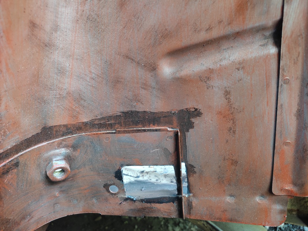 Dans ce côté du caisson c'était plus attaqué par la rouille j'ai du refaire la plaque à la base du renfort, j'ai brossé ce que j'ai pu et 2 couches de ferose, 1 d'apprêt antirouille gris et un coup de bombe d'apprêt antirouille soudable.(photo ).La gouttière paraît relevée a la base sur la photo je suis retourné voir 2 fois finalement c'est au milieu qu'elle est légèrement plus basse, j'ai tapé au marteau ça bouge pas, mais bon en roulant vite ça se verra pas