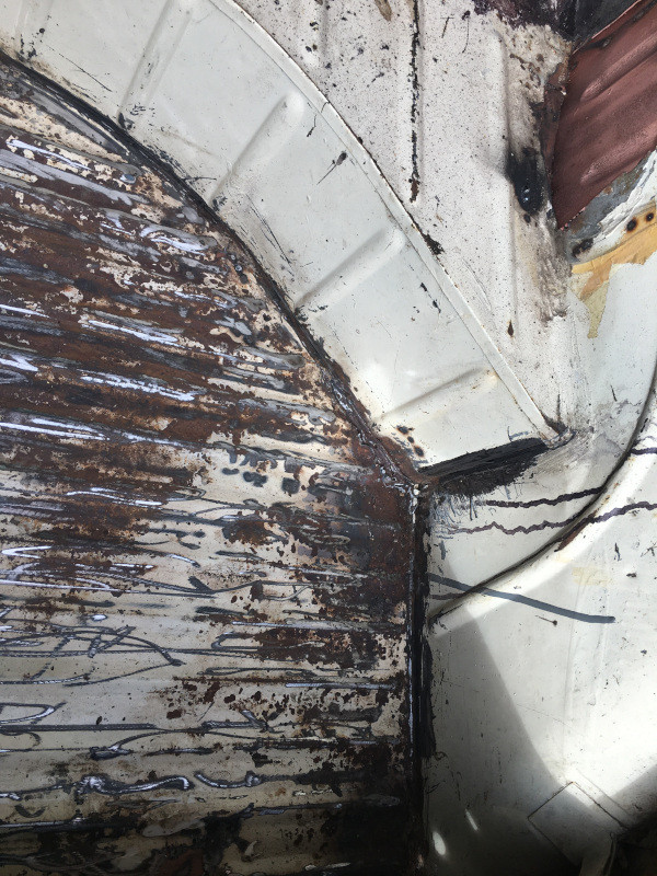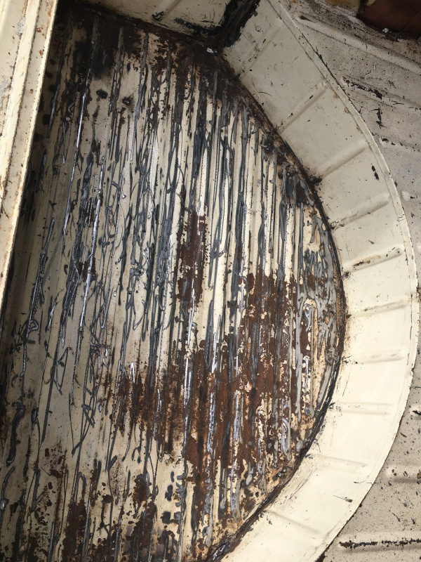 Le fond, gratté mais bien rouillé. J'ai réussi à décoller l'ancien mastic d'étanchéité, en m'aidant du décapeur thermique, qui, une fois de plus, a fait des merveilles.