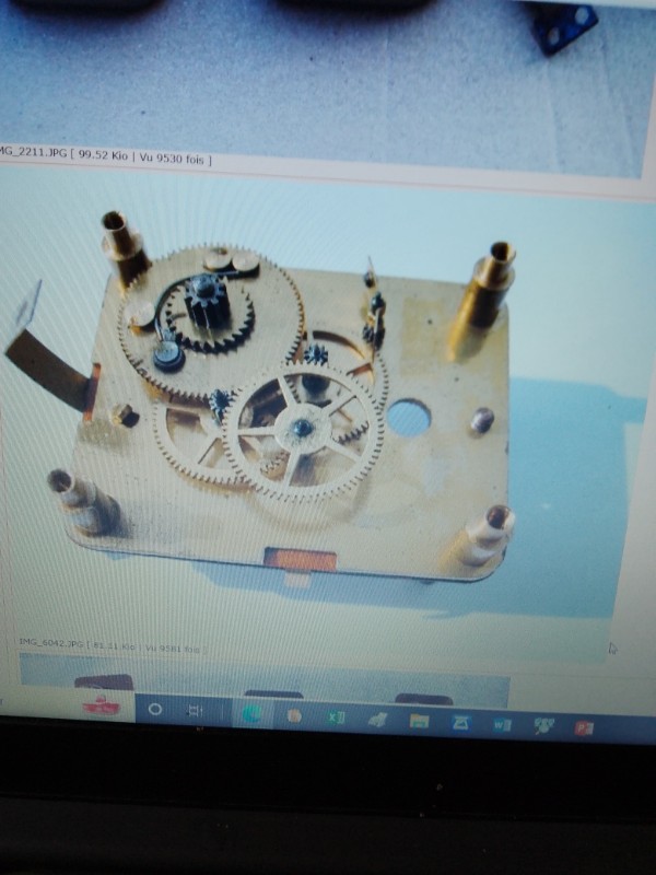Mais je trouve aussi cette photo: Euréka, youpi, youpi voilà l'ordre de remontage de tous les pignons du mécanisme à friction que j'ai laissé en souffrance dans ma traversée du désert (De Gaulle quand tu nous tiens!). Deux ans que toutes les pièces sont dans un bac plastique qui a pris la poussière et dont mon cerveau embrumé a oublié l'ordre de remontage. De plus, en étudiant mieux la foto (j'ai le droit) je comprends la panne qui m'a poussé à tout démonter: Au bout de la flèche (tremblotante) se trouve un cliquet poussé par un ressort contre le pignon. C'est lui qui est censé produire le clignotement désiré. Or, ce cliquet est grippé. Hop, un petit coup de doublevédécarante et j'entreprends le remontage en me servant du cliché bienvenu (comme mon voisin, ben oui, c'est pas de ma faute s'il se prénomme Benvenido). A ce stade, j'ai réassemblé toute l'ossature en retrouvant la place des plaques métalliques et-ou isolantes intercalées, avec les trous en face des trous, à l'envers à l'endroit, des heures assis devant mon bureau-établi, bercé par Jo Dassin sur Nostalgie ( je vous parle d'un temps...)
